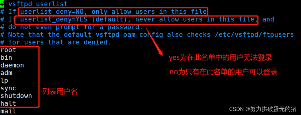 userlist_deny=NO #设置白名单,仅允许user_list用户列表文件的用户访问
