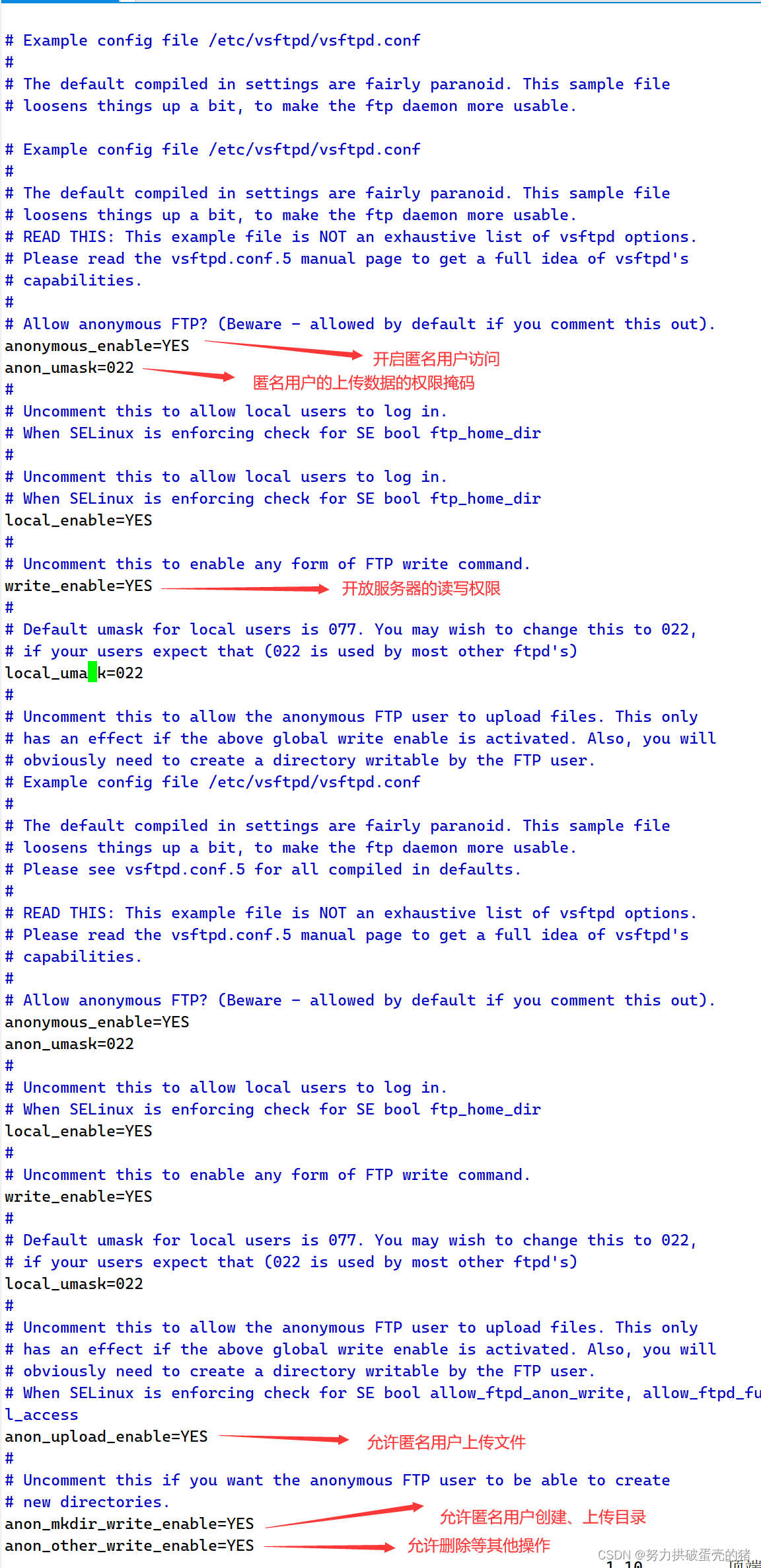anon_upload_enable=YES #允许匿名用户上传文件。默认已注释,需取消注释