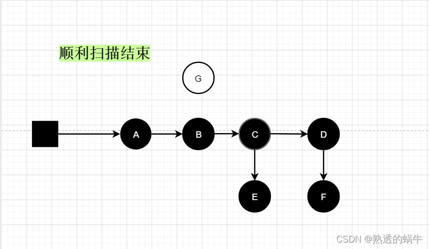 此时扫描完成,黑色对象就是存活的对象,即可可达对象,白色对象G为不可达对象,在垃圾回收时就会被回收掉。