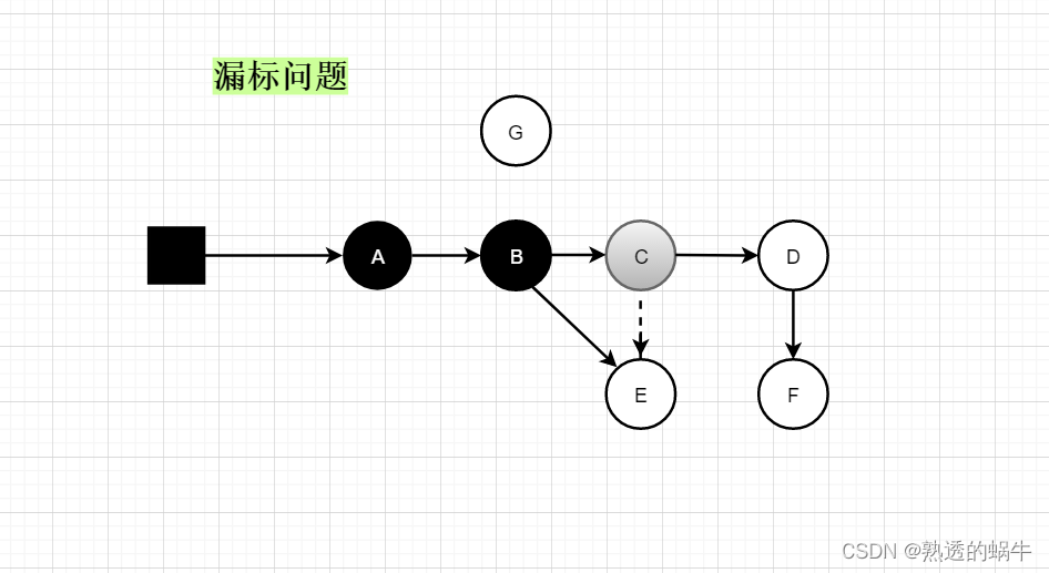 上面演示了三色标记法存在的一些问题,那么如何解决这些问题呢。首先存在以上问题有两个条件同时满足才会发生