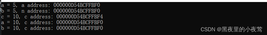 乍一看,这种意图暂时是成功的,因为 b 的值从 5 变为了 10.但仔细研究将发现,a 也变成了 10,同时 a 和 b 的地址相同,但该地址与 c 的地址不同。由于 b 是 a 的别名,因此上述赋值语句相当于下面的这条语句: