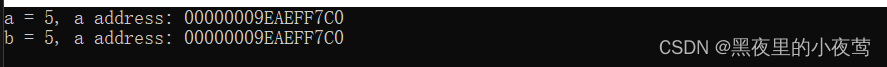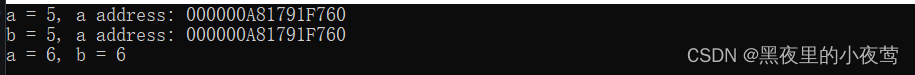 上述程序输出表明了,引用声明的变量 b 和 变量a 是同一个变量,在同一块内存中(b是a的别名)。