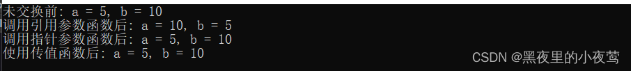 按引用传递(swap1(a, b))和按值传递(swap3(a, b))(调用它们) 看起来相同,只能通过函数原型或函数定义才知道swap1()是按引用传递。但它们还是有区别的。