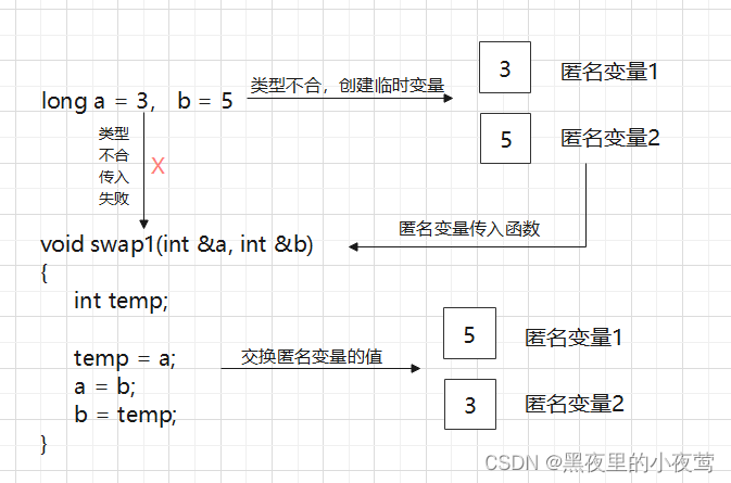 这里类型不匹配,因此编译器将创建两个临时变量,将它们初始化为 3 和 5,然后交换临时变量的内容,而 a 和 b 保持不变。