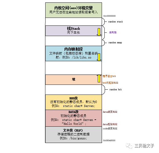 这个区域有两个段,分别是BSS段和DATA段,均存放着全局变量和静态变量(包括全局静态变量和局部静态变量),其中BSS存放的是程序员编写的未初始化的全局变量和静态变量(这其中C和C++的BSS还有区别,区别就是:C中的BSS段分为高地址和低地址,高地址是存放全局变量,低地址是存放静态未初始化);而DATA存放已经初始化的全局变量、静态变量和常量。