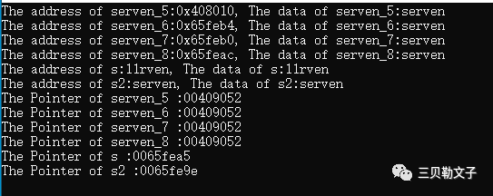变量serven_5是常量,存储在DATA段区域,serven_6是局部的常量、serven_7和serven_8是局部的变量指针,他们都是指向一个常量“serven”,这个常量存储在常量区的,也就是存储在DATA区域,可以看到在后面打印serven_5~serven_8的时候的地址都是一样的,都是存储在DATA区域。而s和s2是局部变量,存储在栈区域,可以看到代码中打印出来的指针都是在栈区域里面。总结就是:s和s2是定义在局部函数里面的变量,所以存放在栈区域,serven_6~serven_8是定义在局部里面的指针,指向的是常量,所以指向的常量存放在DATA区域,而指针本身存放在栈。