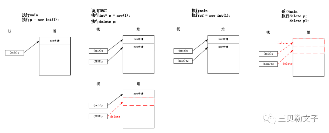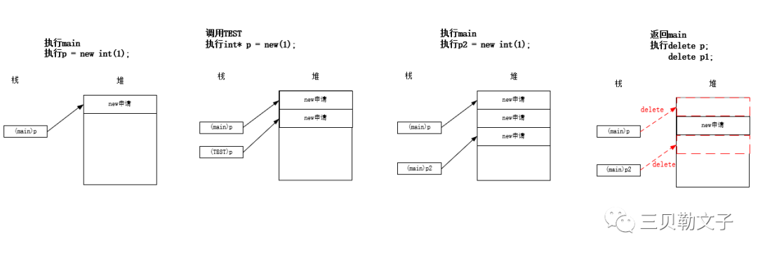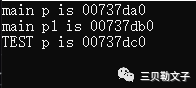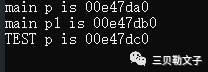 首先在main函数中new了一个p,然后在new了一个p1,最后在调用TEST函数,new了一个p。三个指针申请的内存区域均不一样。
