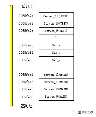 首先我们先来看一下这个图,是内存管理机制里面的栈,可以看到main函数中定义的变量serven_9 ~ serven_13分别入栈,而且入栈的顺序是从高地址到低地址,每个变量占用4个字节,所以地址相差也就是4个字节。然后就是形参入栈,形参入栈顺序是从右往左入栈,所以ser_z~ser_x的地址也是依次递减的,最后就是TEST函数里面的局部变量,将局部变量serven_9 ~ serven_11依次入栈,并且地址也是一次递减。而且可以看到serven_13的地址和serven_11是隔壁,由此可以看出,栈的先进后出,也就是调用完函数TEST后会把局部变量serven_11(TEST)~serven_9(TEST)、serv_x~ser_z全部出栈,然后再将serven_13入栈。