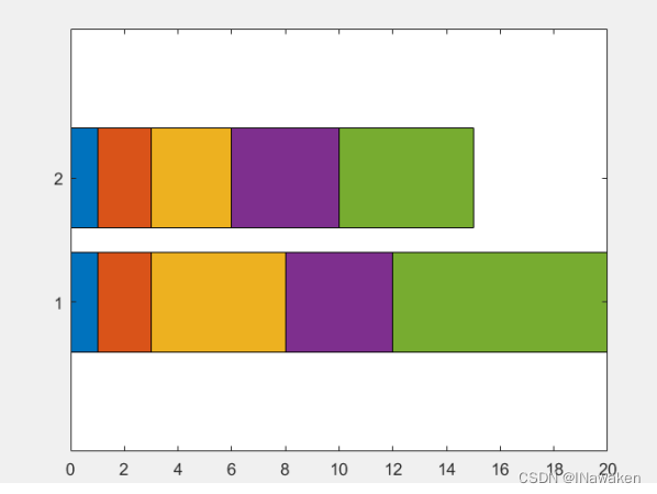 'stacked' - 为 Y 中的每一行显示一个条形。条形高度是行中元素的总和。每个条形标记有多种颜色。不同颜色分别对应不同的元素,显示每行元素占总和的相对量。