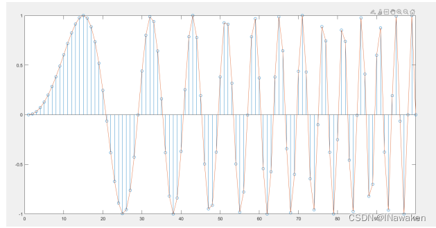 stem(Y) 将数据序列 Y 绘制为从沿 x 轴的基线延伸的针状图。各个数据值由终止每个针状图的圆指示。