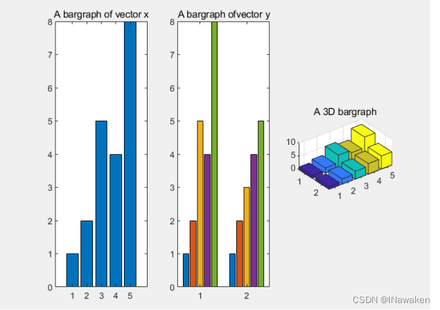 >> subplot(1,3,3);bar3(y);title('A 3D bargraph');