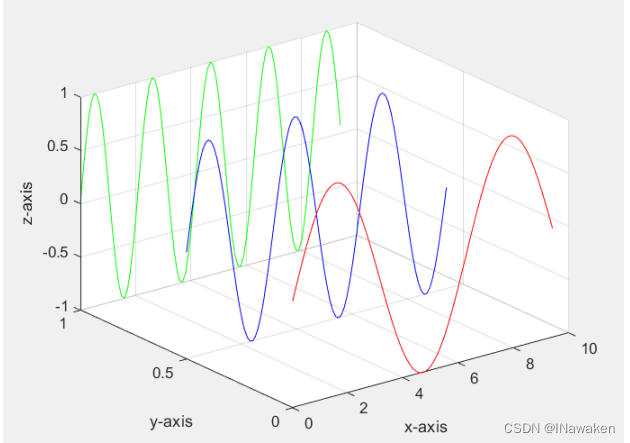 >> plot3(x,y1,z1,'r',x,y2,z2,'b',x,y3,z3,'g');