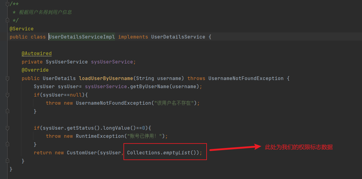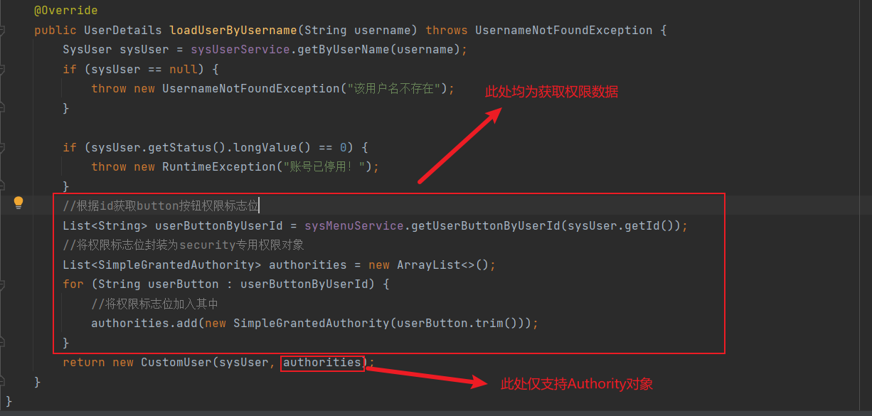 想要达到用户权限的管理,我们需要在UserDetailsService实现类中获取到的我们进行用户权限管理的权限数据,并加至security专用对象中进行认证。