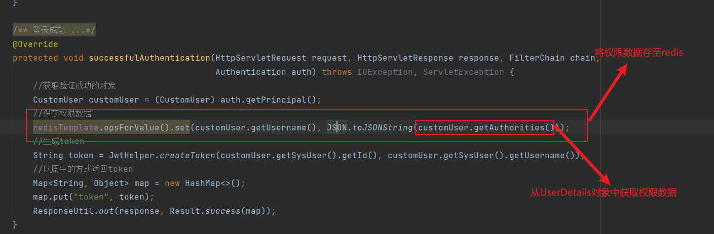 此处通过验证成功将UserDetails对象里面的权限数据存到redis,用于后续的存入SpringSecuritycontext上下文对象中(在构造方法中注明redisTemplate对象,到配置类自动注入)