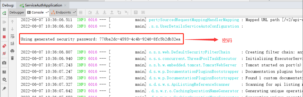 (出现的页面为spring security的默认验证页面),登录的用户名默认为user,密码在项目启动时会在控制台打印,注意每次启动的时候密码都回发生变化!