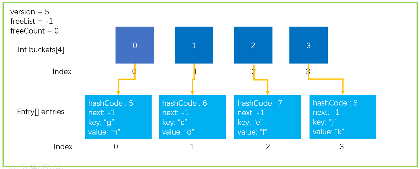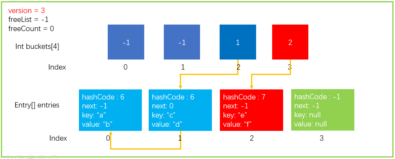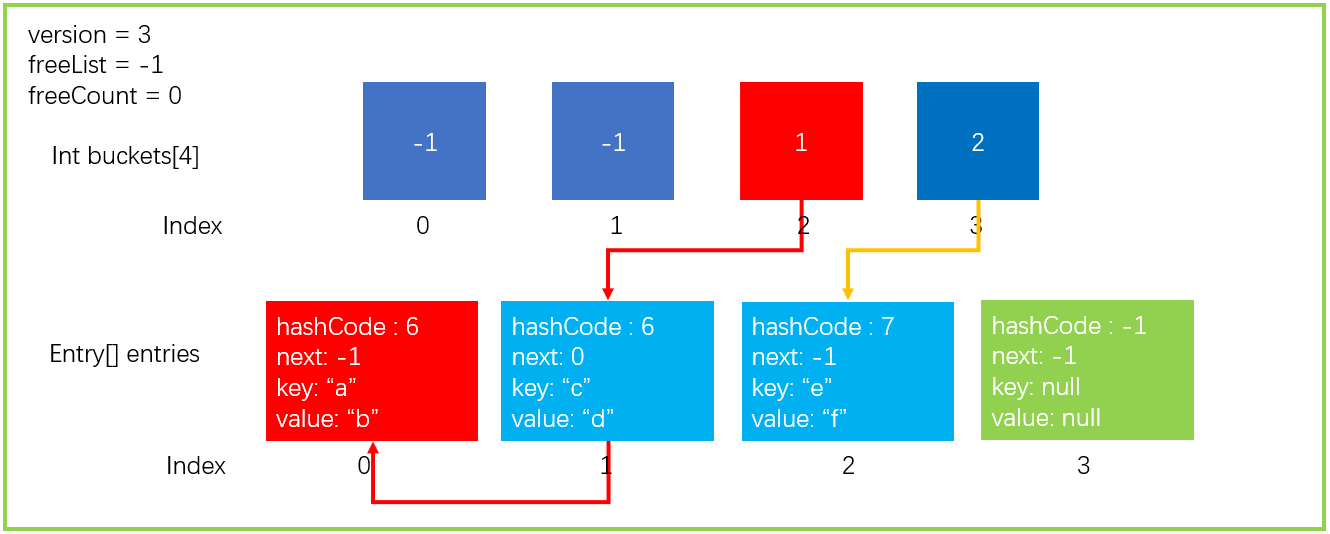 // int i = buckets[hashCode % buckets.Length] 找到对应桶,然后获取entry在entries中位置