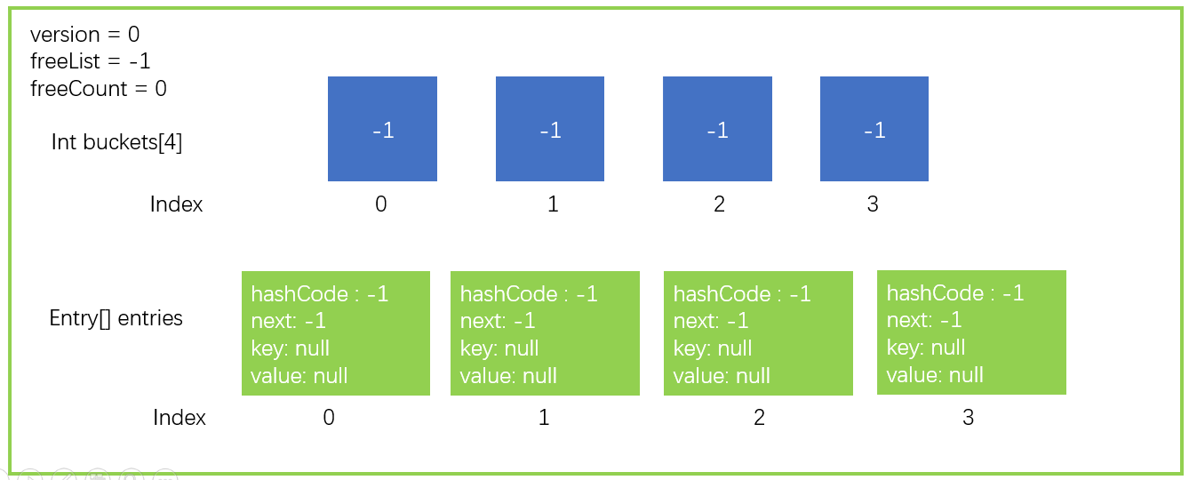 上面代码中,需要注意的是buckets、entries这两个数组,这是实现Dictionary的关键。