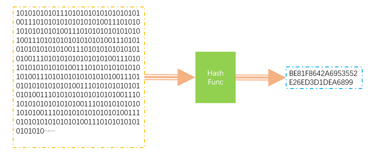 下图就是Hash函数的一个简单说明,任意长度的数据通过HashFunc映射到一个较短的数据集中。