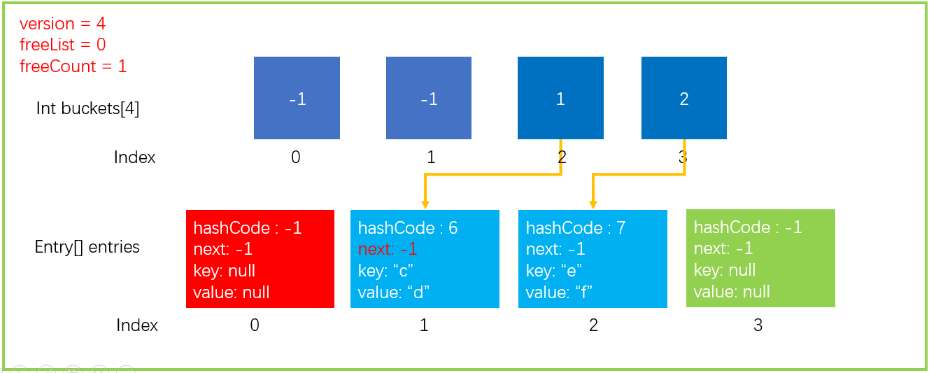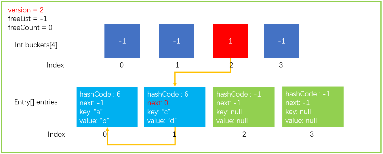 如果继续执行步骤4那么buckets[2] = 1,然后原来的buckets[2]=>entries[0]的关系就会丢失,这是我们不愿意看到的。现在Entry中的next就发挥大作用了。