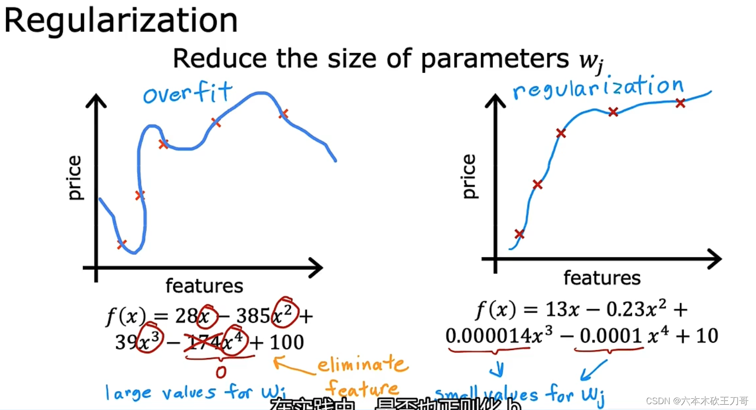 (2)第二个目标与第二项 Regularization term 有关,即我们想要参数wj尽量小keep wj small,