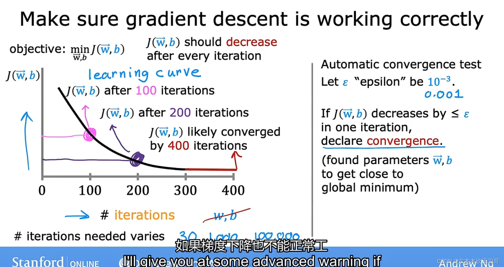 在先前的视频中,当我们在谈论线性回归的梯度下降法时,我们谈到了如何监控梯度下降法以确保其收敛,我通常也把同样的方法用在逻辑回归中,来监测梯度下降,以确保它正常收敛。