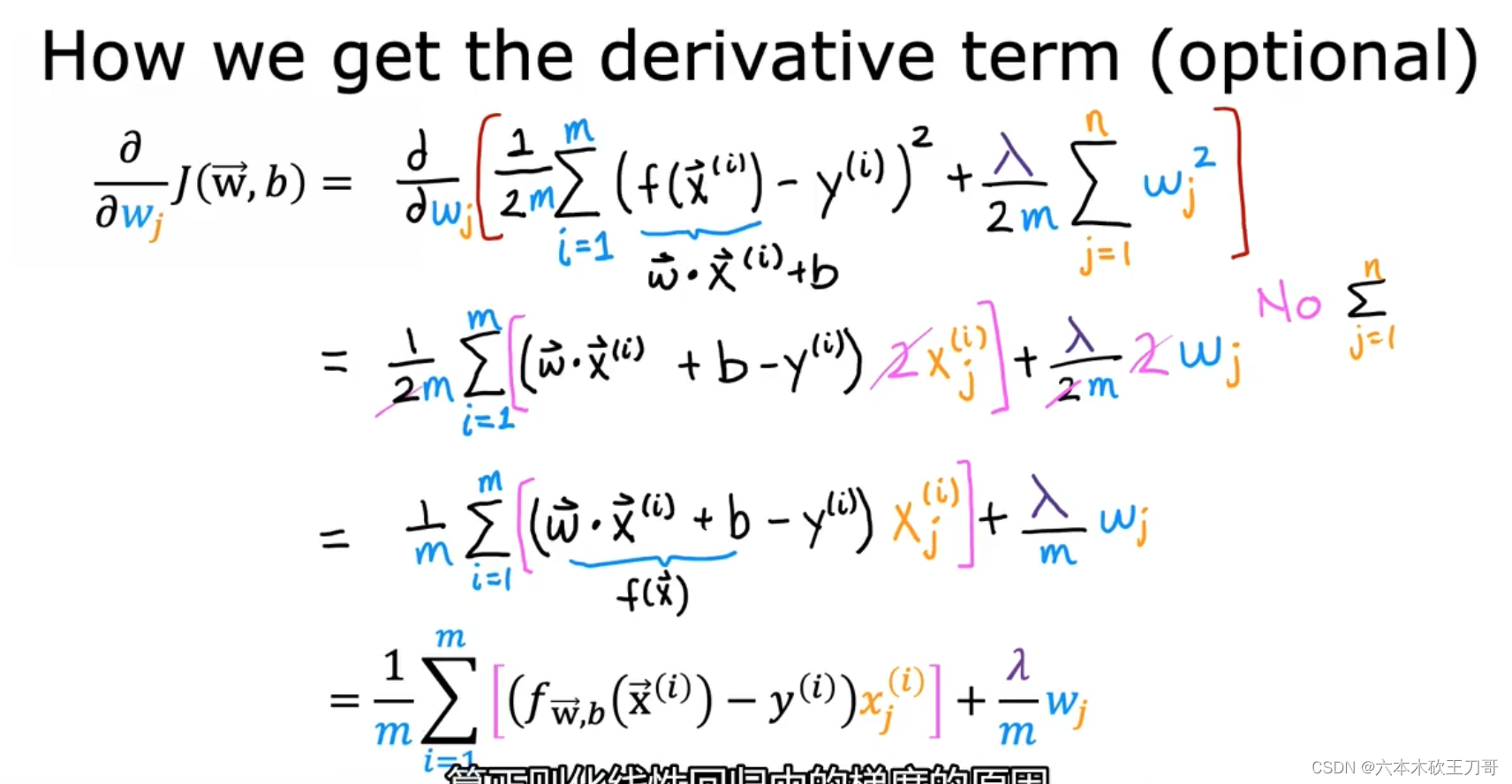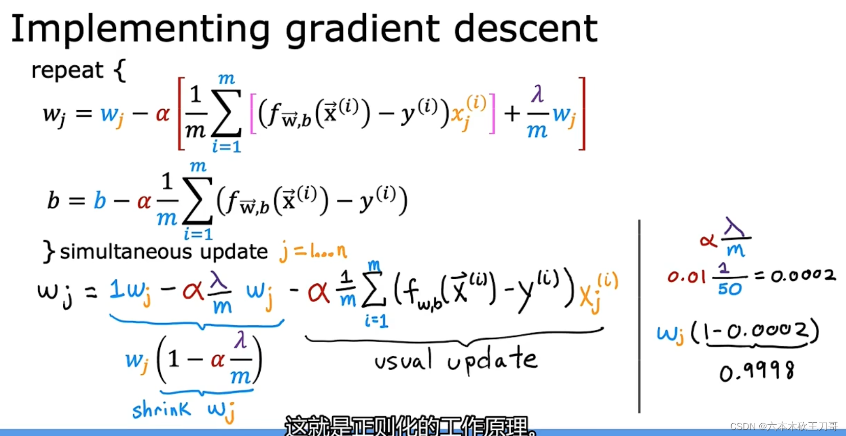 更新公式的数学推导,具体过程是展开并提项,从wj后面括号内的项可以看出,正则化就是在每一次执行gd迭代后,会用一个略微小于1的数乘以wj执行更新,让wj的值变小了一点,这就解释了为什么正则化可以在每次迭代中shrink缩小wj的值。