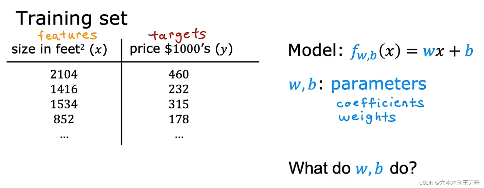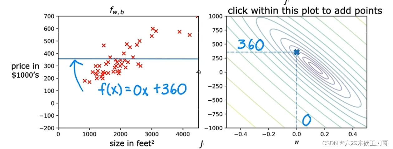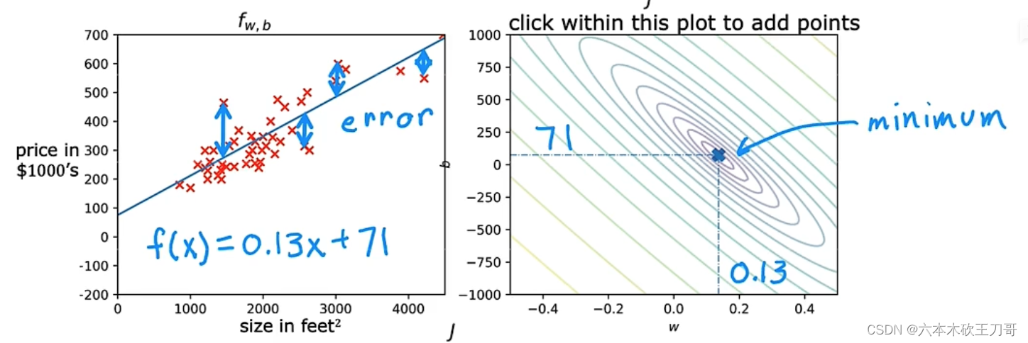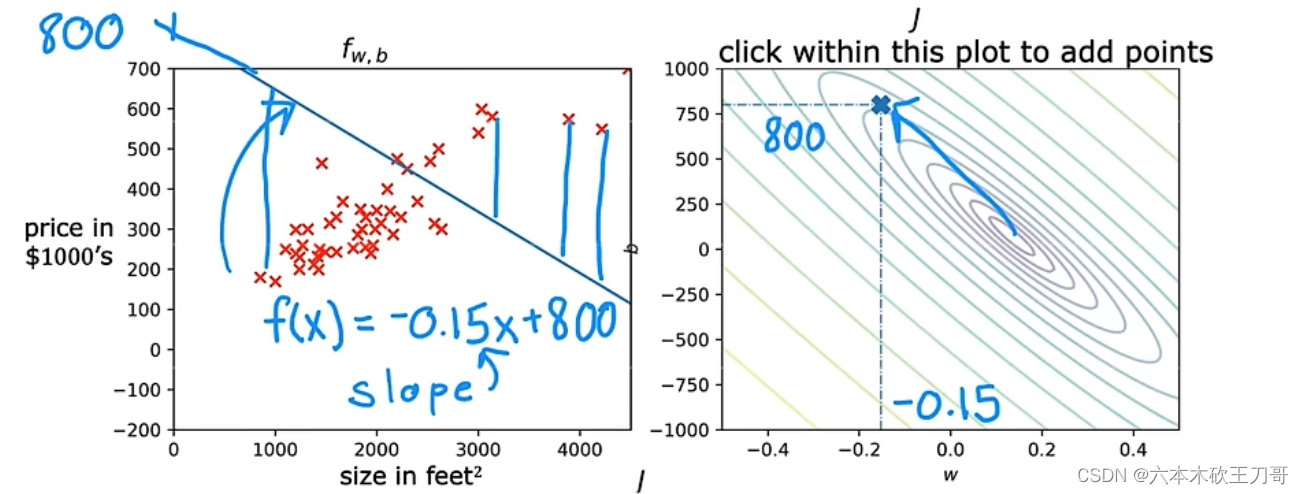 在单变量线性回归模型中,需要明确w和b的作用是什么,也就是为我们的模型选择合适的参数w和b,在房价问题这个例子中便是直线的斜率和在𝑦 轴上的截距。