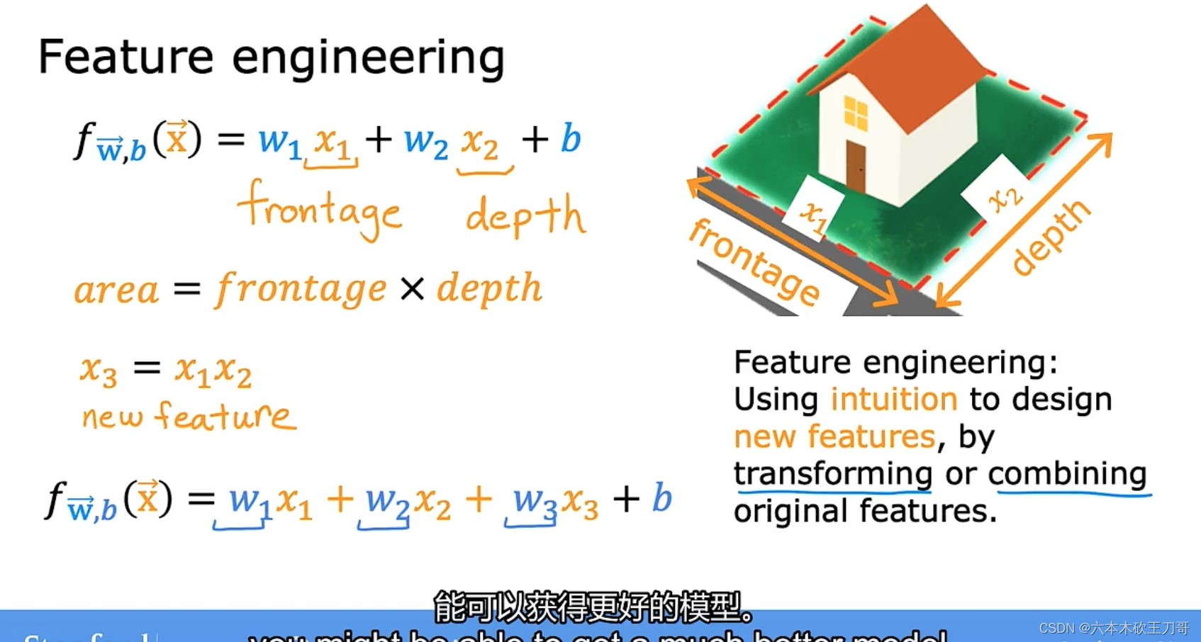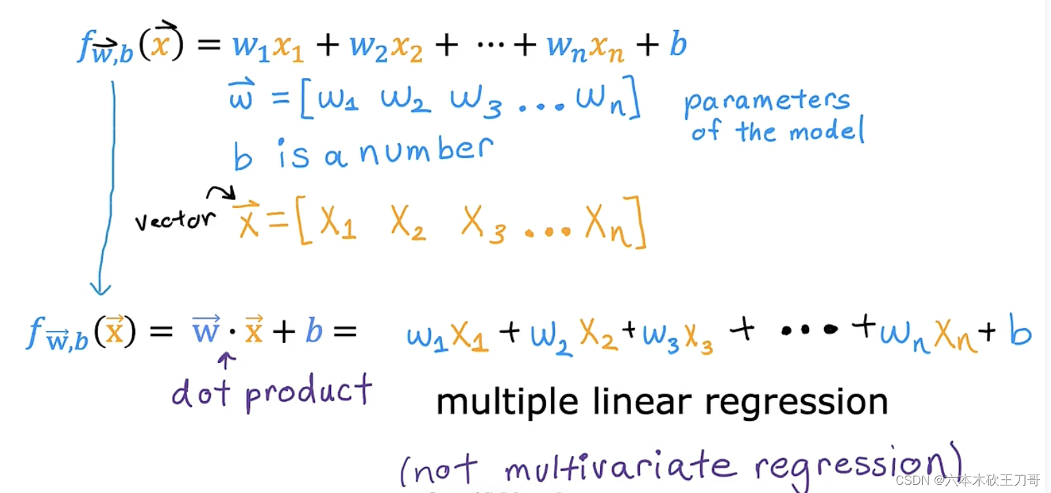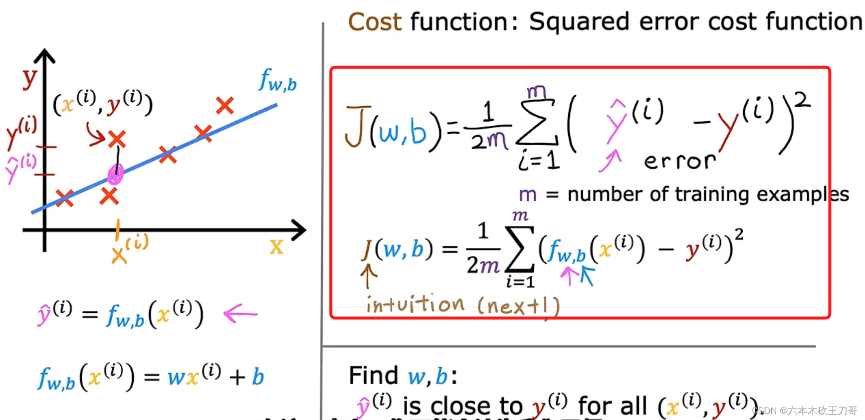 在单变量线性回归模型中,需要明确w和b的作用是什么,也就是为我们的模型选择合适的参数w和b,在房价问题这个例子中便是直线的斜率和在𝑦 轴上的截距。