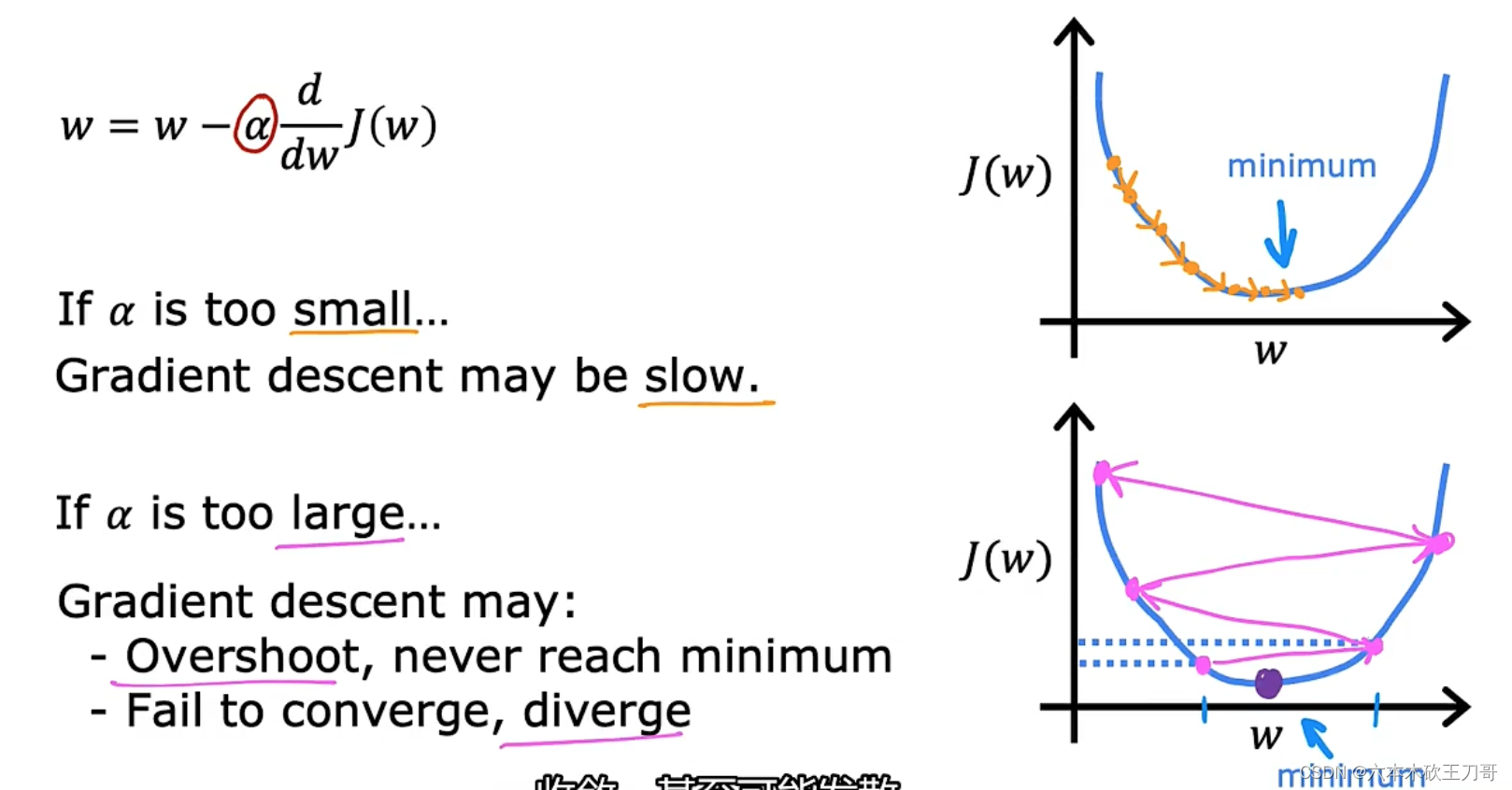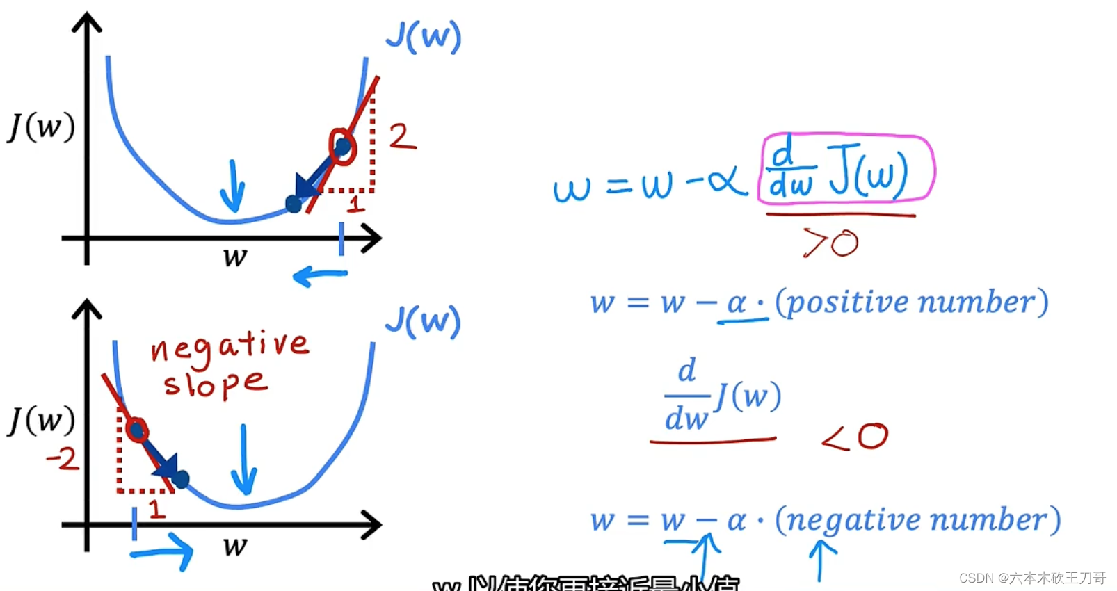 分两种情况讨论,这条线有一个正斜率,也就是说它有正导数,因此,我得到的新的w,w更新后等于w减去一个正数乘以𝑎。另外一种情况负斜率,也就是负导数,此时w更新是w加上一个正数乘𝑎。