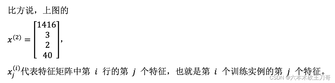𝑥(𝑖)代表第 𝑖 个训练实例,是特征矩阵中的第𝑖行,是一个向量(vector)。