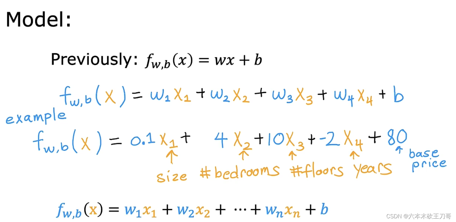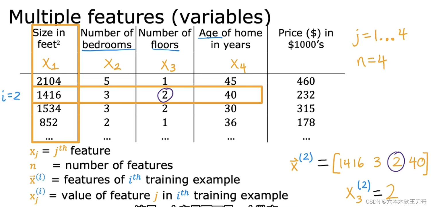 目前为止,我们探讨了单变量/特征的回归模型,现在我们对房价模型增加更多的特征, 例如房间数楼层等,构成一个含有多个变量的模型,模型中的特征为(𝑥1, 𝑥1, . . . , 𝑥𝑛)。
