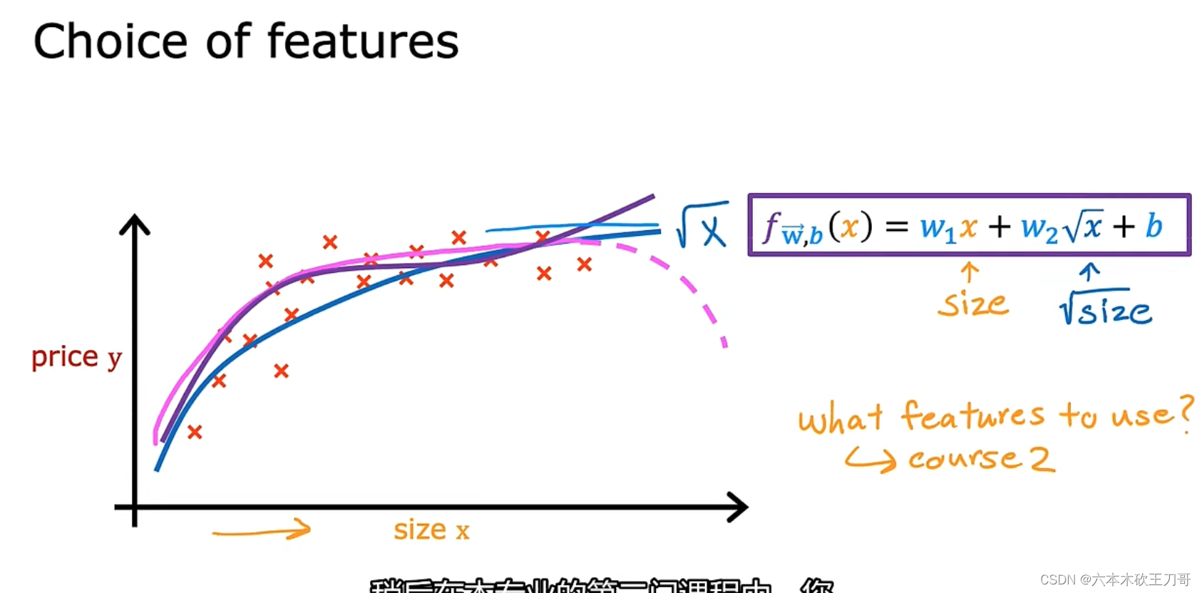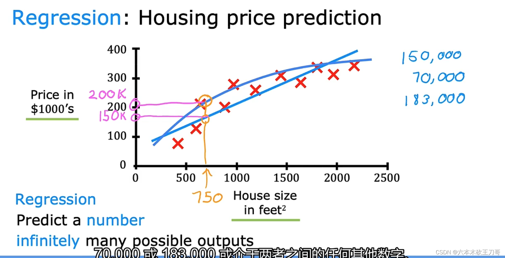 我们应用学习算法,可以在这组数据中画一条直线,或者换句话说,拟合一条直线,根据这条线我们可以推测出,这套房子可能卖$150,000,当然这不是唯一的算法。可能还有更 好的,比如我们不用直线拟合这些数据,用二次方程去拟合可能效果会更好。根据二次方程的曲线,我们可以从这个点推测出,这套房子能卖接近$200,000。稍后我们将讨论如何选择学习算法,如何决定用直线还是二次方程来拟合。两个方案中有一个能让你朋友的房子出售得更合理。这些都是学习算法里面很好的例子。以上就是监督学习的例子。