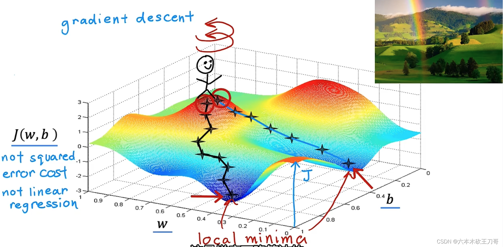 梯度下降背后的思想是:开始时我们随机选择一个参数的组合(w,b),计算代价函数,然后我们寻找下一个能让代价函数值下降最多的参数组合。我们持续这么做直到一个局部最小值(local minimum),因为我们并没有尝试完所有的参数组合,所以不能确定我们得到的局部最小值是否便是全局最小值(global minimum),选择不同的初始参数组合,可能会找到不同的局部最小值。