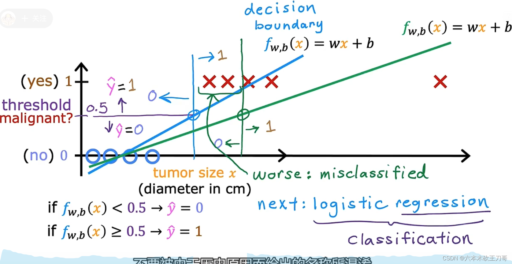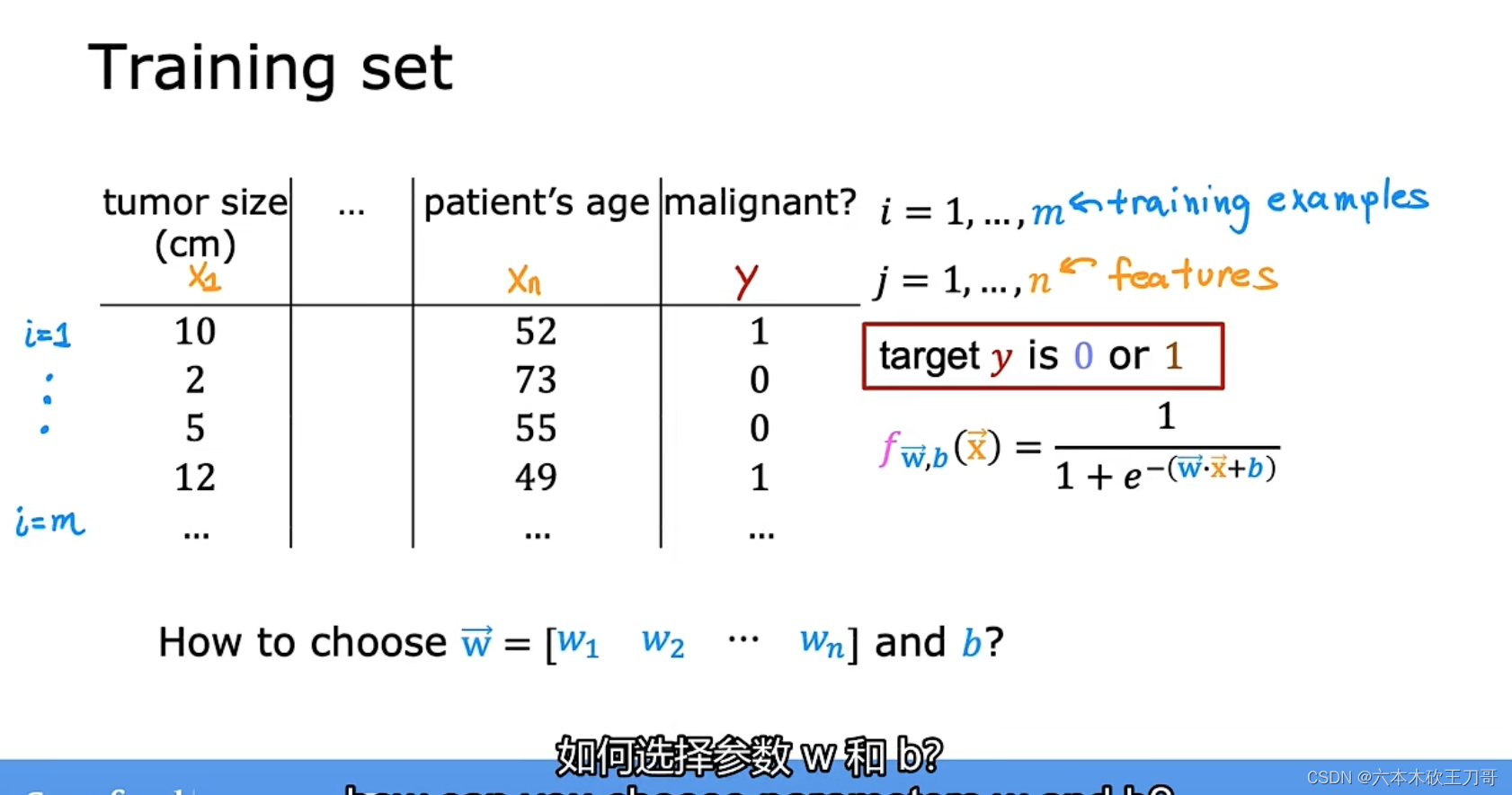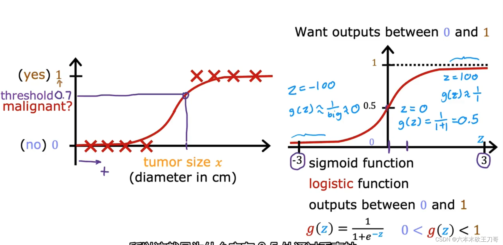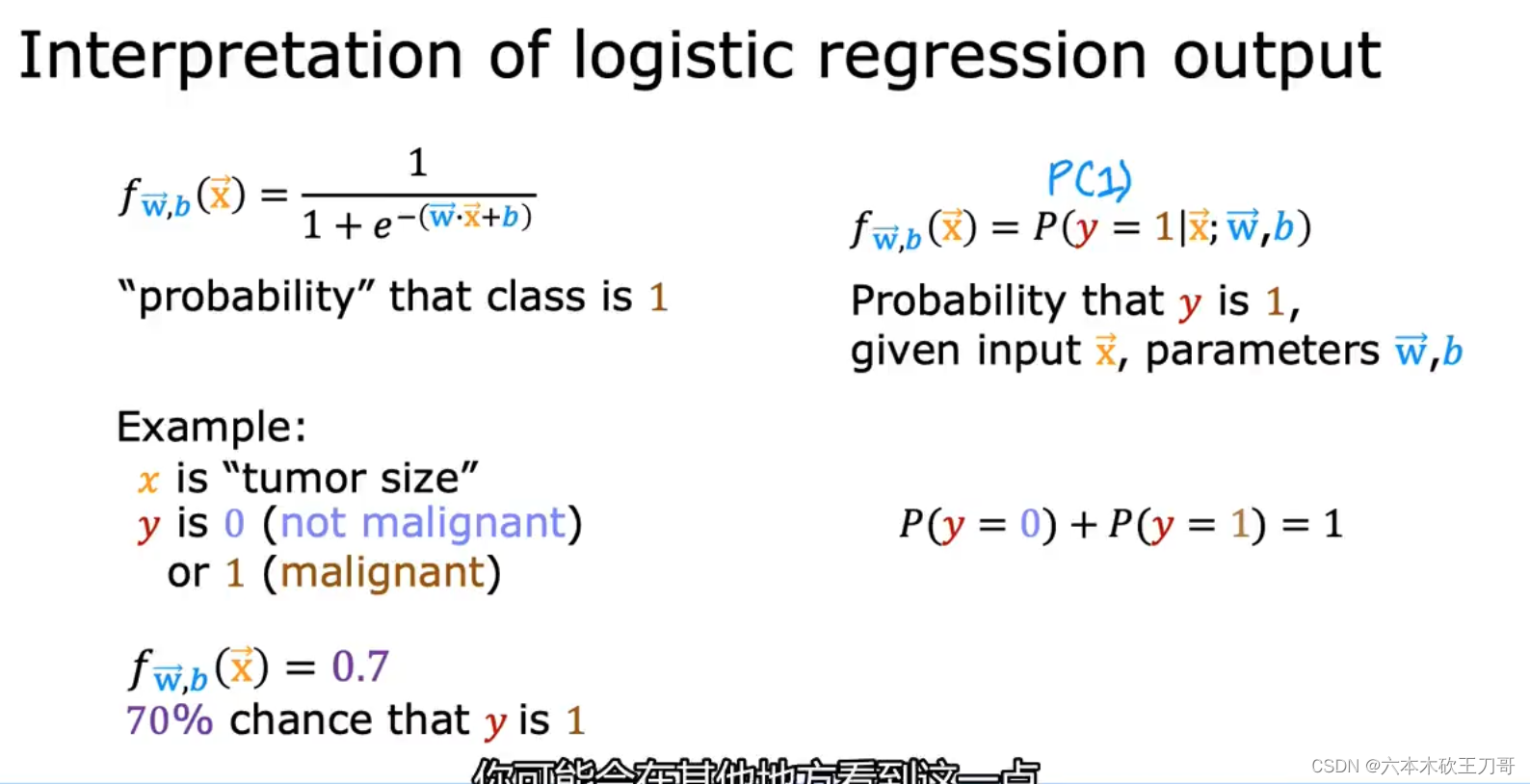下面来看一下这个函数的相关解释,如果给出肿瘤大小x,此时输出的值为0.7,说明此时肿瘤恶性的概率为70%,为了保证结果只为1或者0,我们认为肿瘤良性的概率为0.3,此时两个概率相加为1,在一些不同的数学表示上,用条件概率来表示这个概念,当给出x以及w和b基础上,得到y=1的概率。