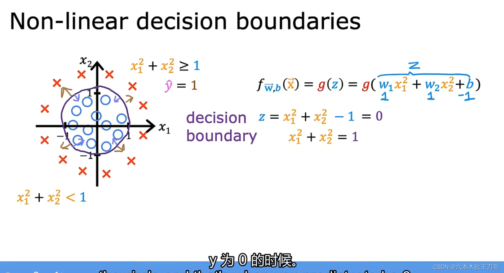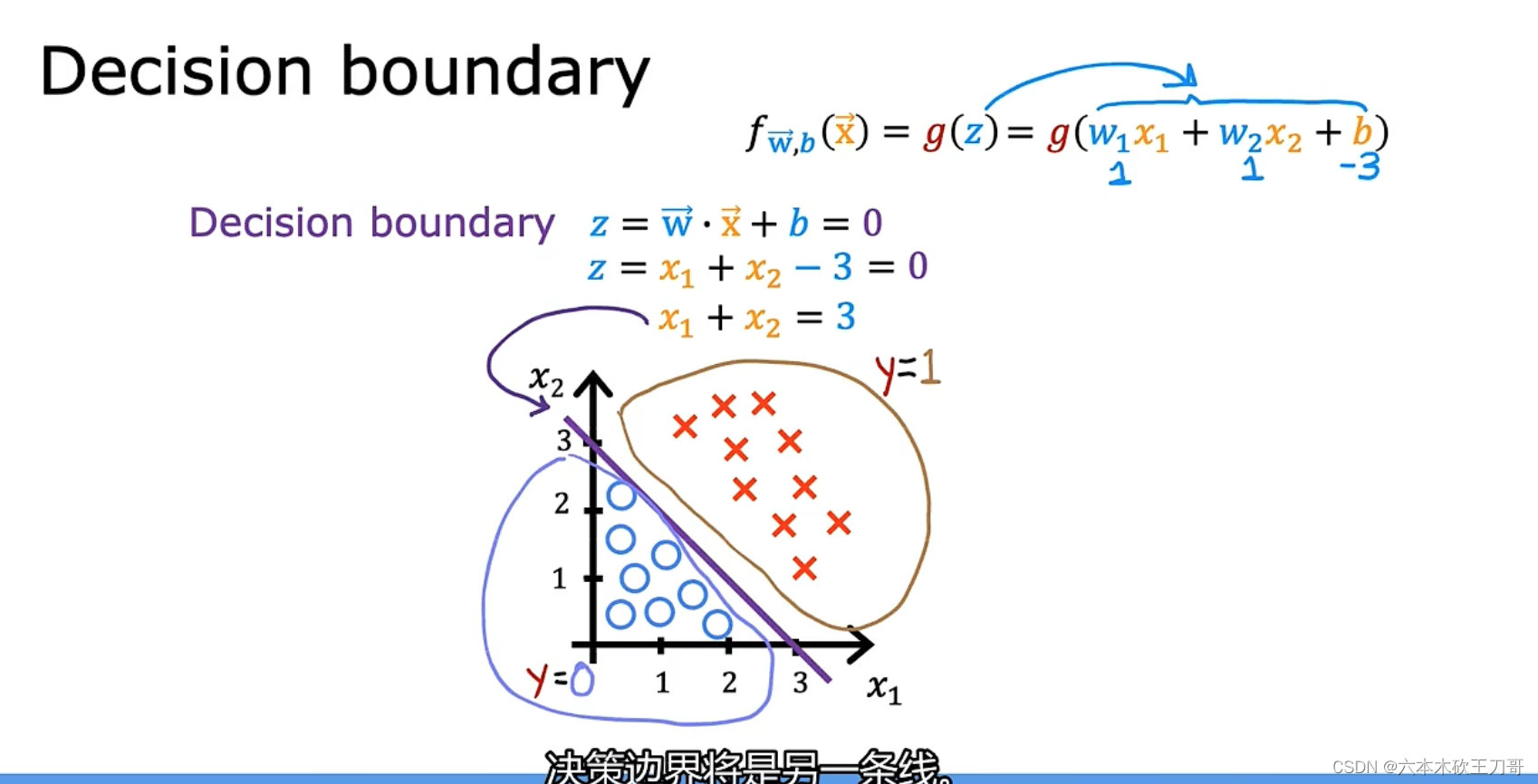 下列的分类问题中,如何划分y=0和y=1的情况,引入之前的g(z),z大于0和小于0的时候分别预测为0和1,所以此时要找到z=0的那条线,在这种情况下,有两个特征x1和x2,让w1和w2都为1,b为3,此时决策边界是下图的一条直线。当然如果选用不同的参数值,那么决策边界也可以是别的直线。