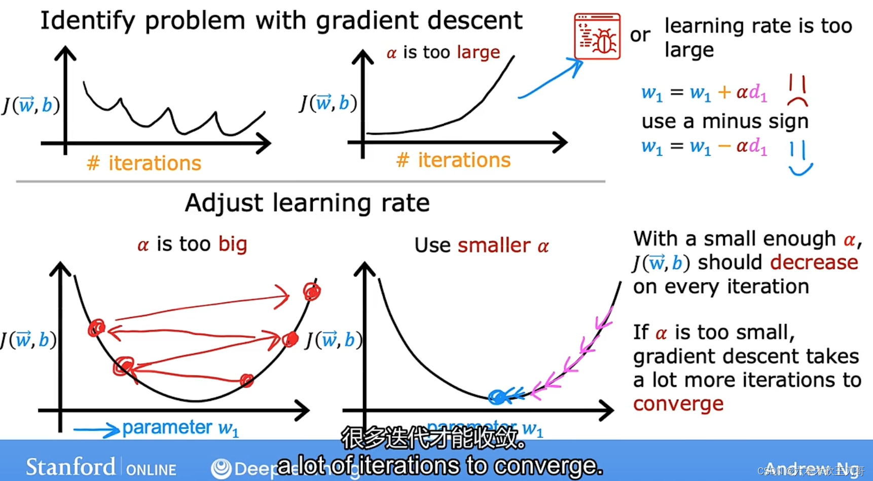 如果𝑎太大,那么梯度下降法可能会越过最低点,甚至可能无法收敛,下一次迭代又移动了一大步,越过一次,又越过一次,一次次越过最低点,直到你发现实际上离最低点越来越远,所以,如果𝑎太大,它会导致无法收敛,甚至发散。