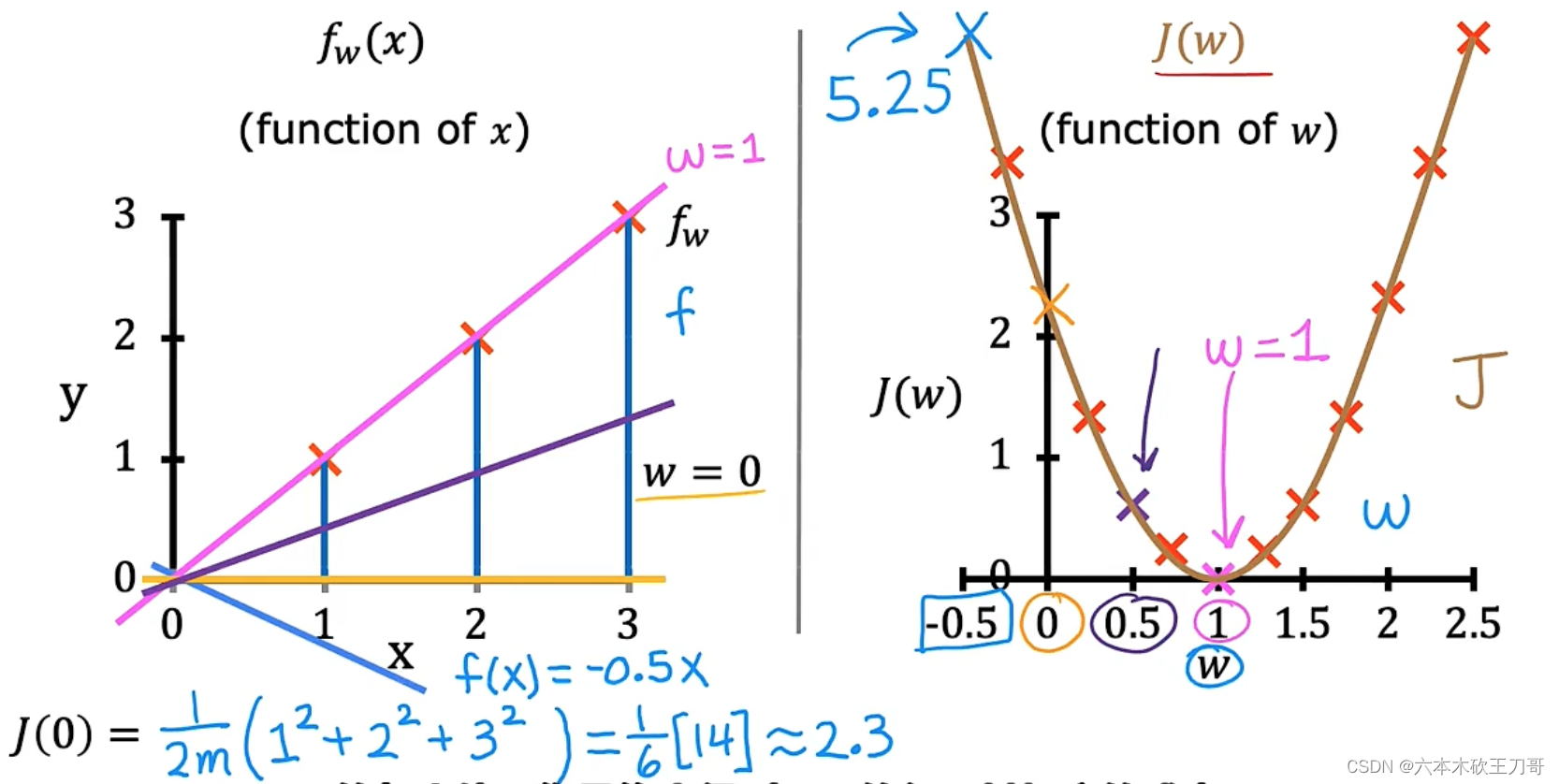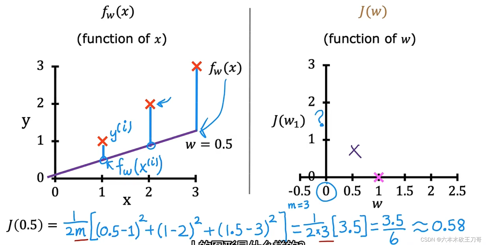 现在开始绘制J(w)的图像,假设训练集的数据如下左图所示,当w等于1时,J(w) = 0。