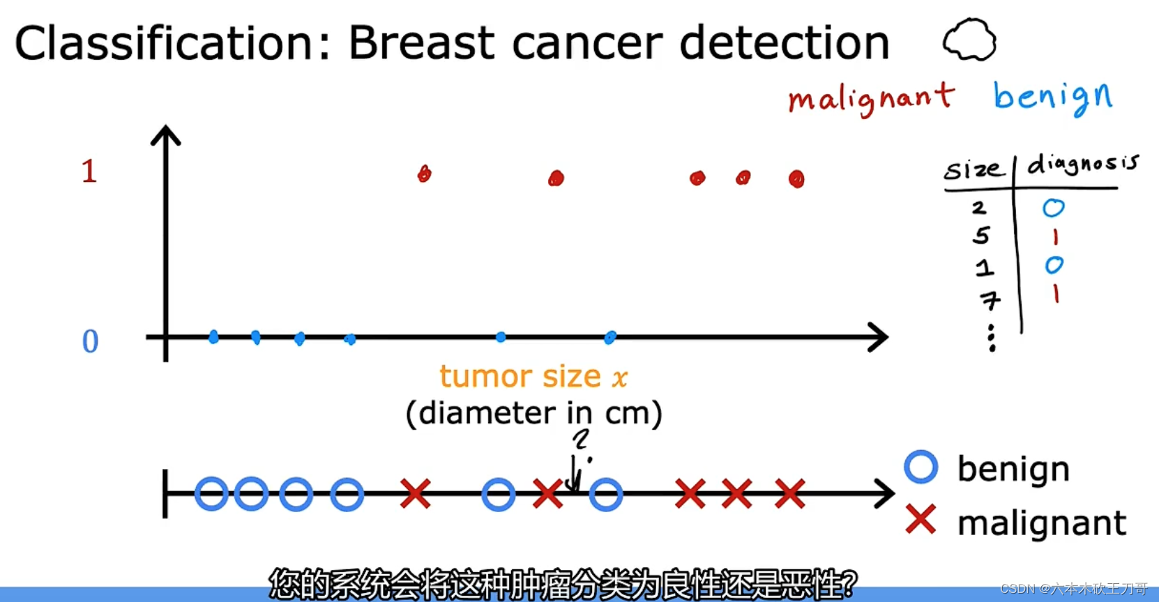 我有 5 个良性肿瘤样本,在 1 的位置有 5 个恶性肿瘤样本。现在我们有一个朋友很不幸 检查出乳腺肿瘤。假设说她的肿瘤大概这么大,那么机器学习的问题就在于,你能否估算出肿瘤是恶性的或是良性的概率。用术语来讲,这是一个分类问题。