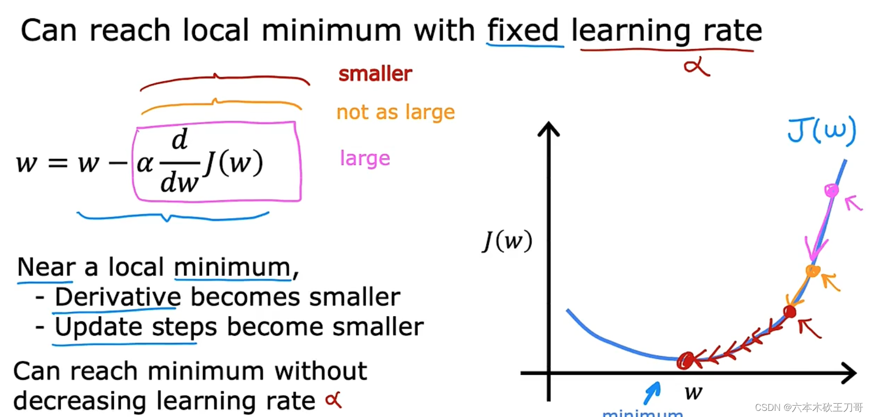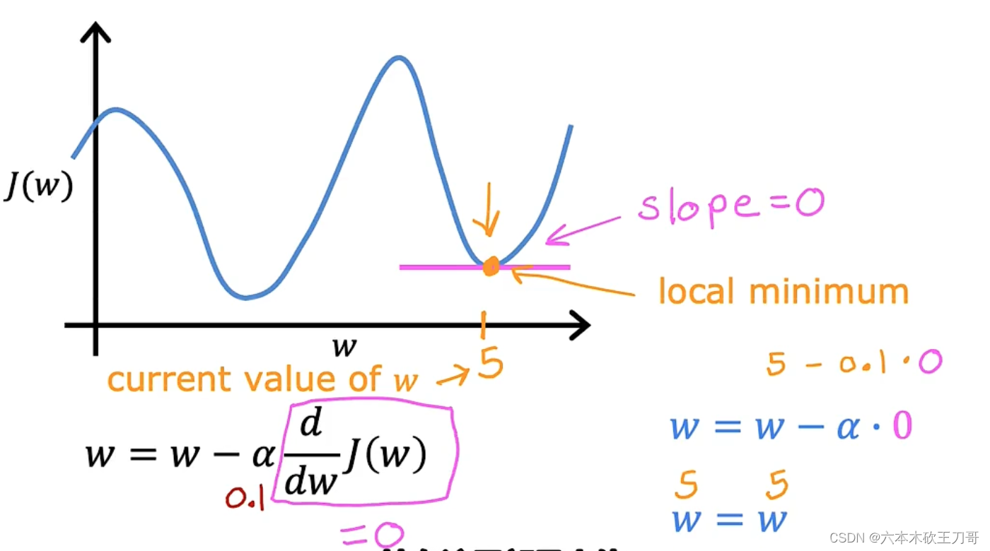 结果是局部最优点的导数将等于零,因为它是那条切线的斜率。这意味着你已经在局部最优点,它使得w不再改变,也就是新的w等于原来的w,因此,如果你的参数已经处于局部最低点,那么梯度下降法更新其实什么都没做,它不会改变参数的值。这也解释了为什么即使学习速率𝑎保持不变时,梯度下降也可以收敛到局部最低点。
