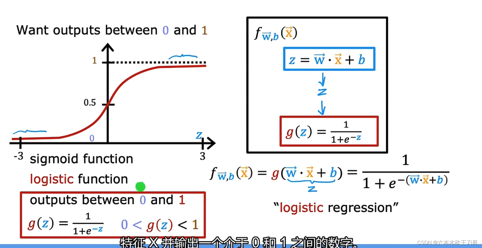 更进一步,如果我们把之前的线性回归函数表达式wx+b代入z,得到关于x的新的表达式f(x) = g(wx+b),这样就可以把输出限制到了0到1之间。