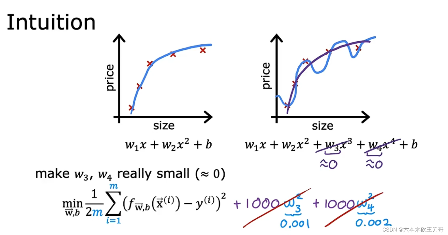下图的直觉告诉我们,在图一的代价函数基础上,如果增加两个系数较大的高次项,为了最小化代价函数,自然而然地w3,w4要接近于0,从而去除了这两项,相当于惩罚这两项使得原来的式子变为二次函数。在一般的回归函数中,使参数的值更小一般会使得曲线更为平滑而减少过拟合情况的发生。