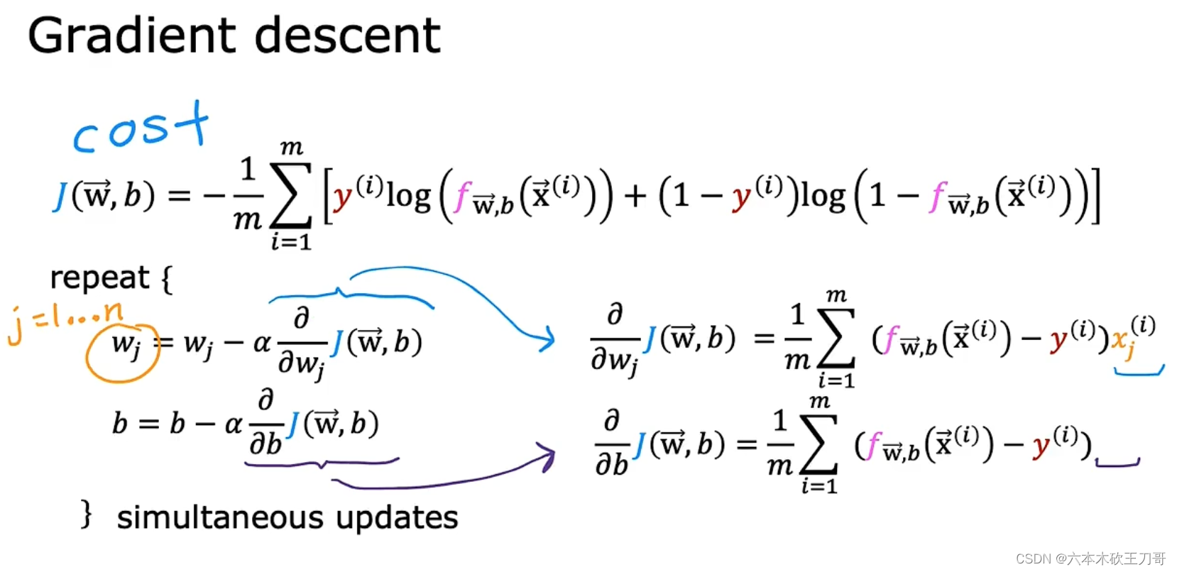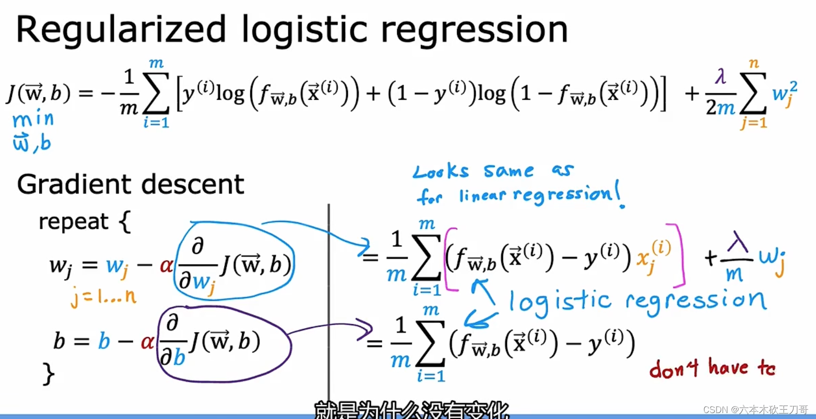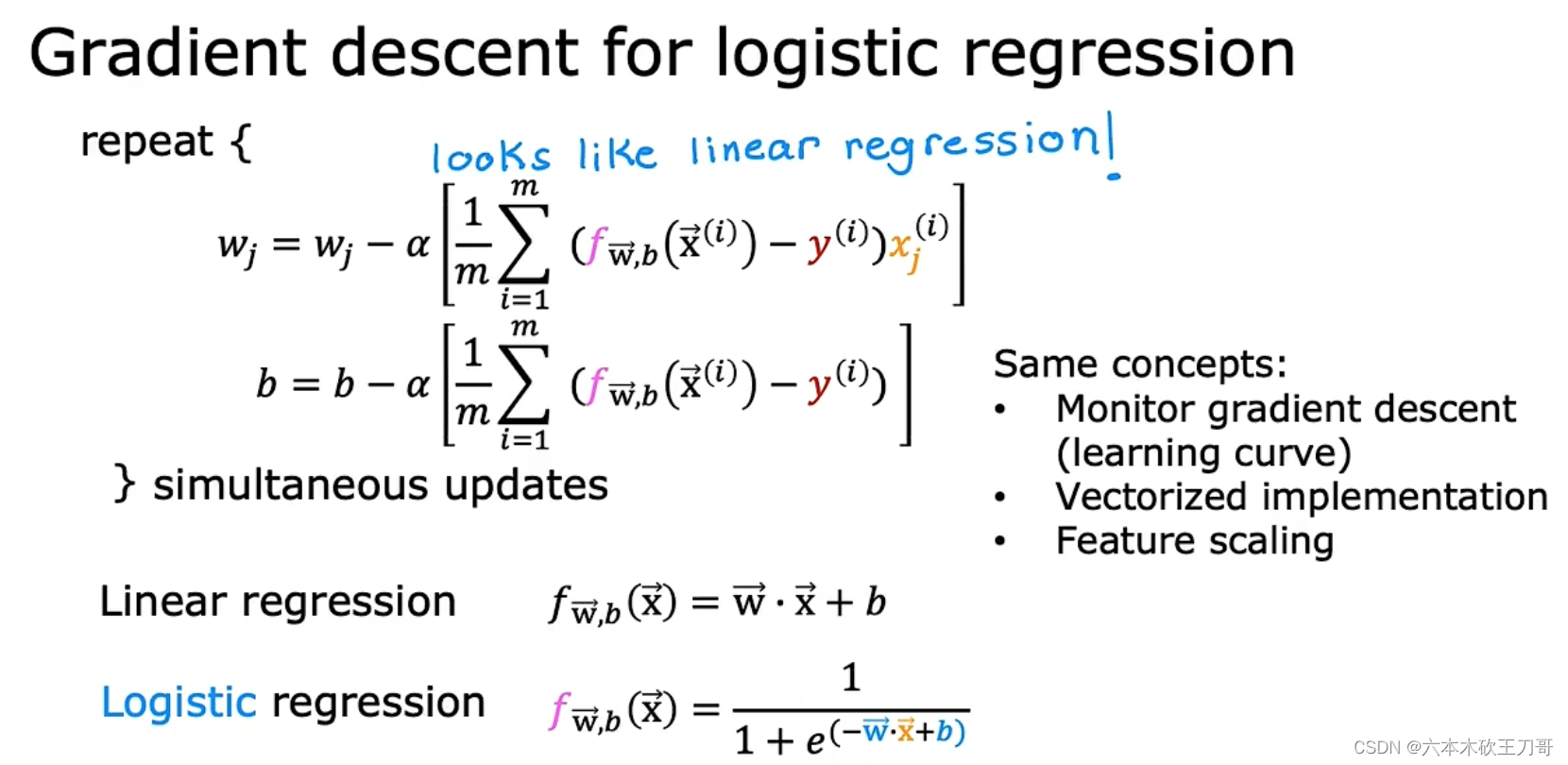 逻辑回归的梯度下降看似与线性回归的梯度下降相同,但本质不同,因为他们的fx的原型不一样。