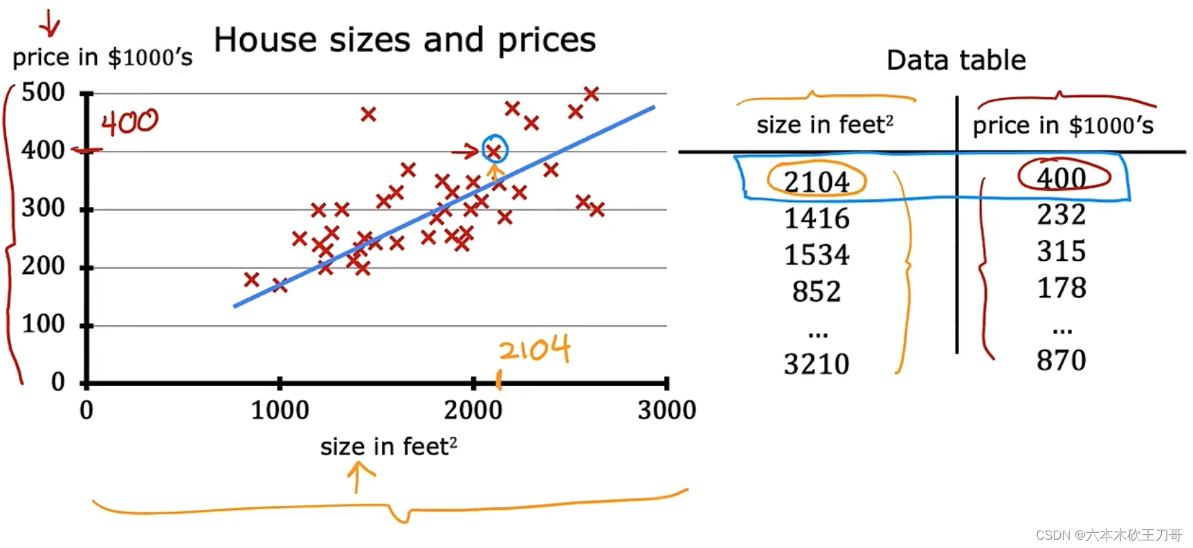 这个例子是预测住房价格的,我们要使用一个数据集,数据集包含俄勒冈州波特兰市的住房价格。它被称作监督学习是因为对于每个数据来说,我们给出了“正确的答案”,即告诉我们: 根据我们的数据来说,房子实际的价格是多少,而且,更具体来说,这是一个回归问题。回 归一词指的是,我们根据之前的数据预测出一个准确的输出值,对于这个例子就是价格。