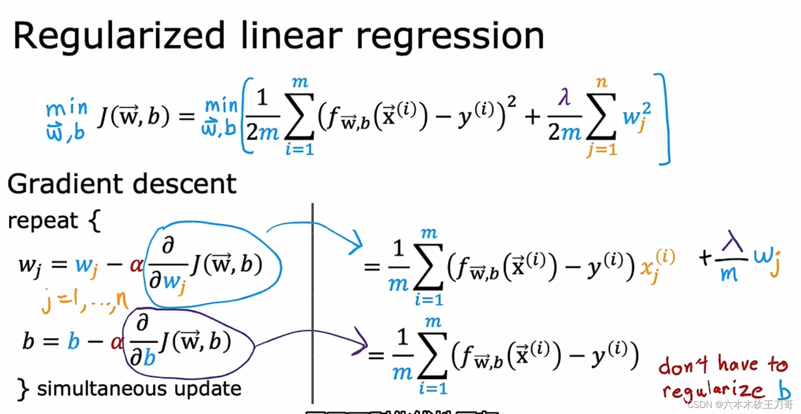 惩罚从w1到wn,不包括b(之所以不惩罚b是为了让拟合的函数尽量简单,极端情况就是J = b,代表的一条水平线,不过实操中有无b影响不大)