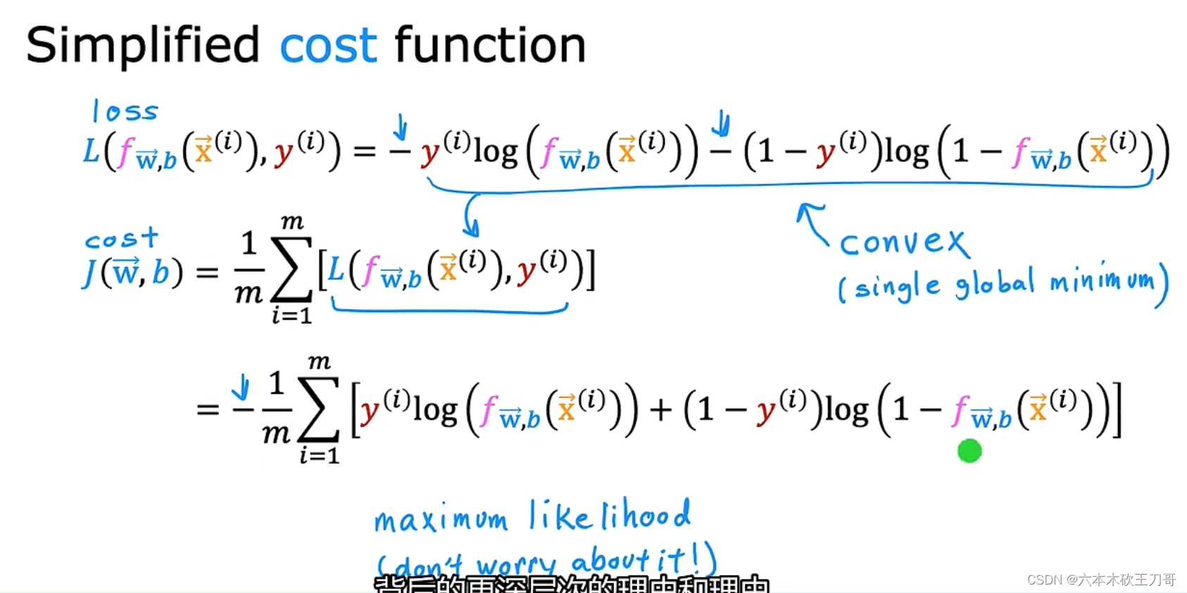 结合了以上损失函数,我们把它代入到代价函数cost function中,为什么获得这个结果呢?因为推导自最大似然估计,但是并不需要理解它,这只是这个代价函数背后的深层次的数学知识。