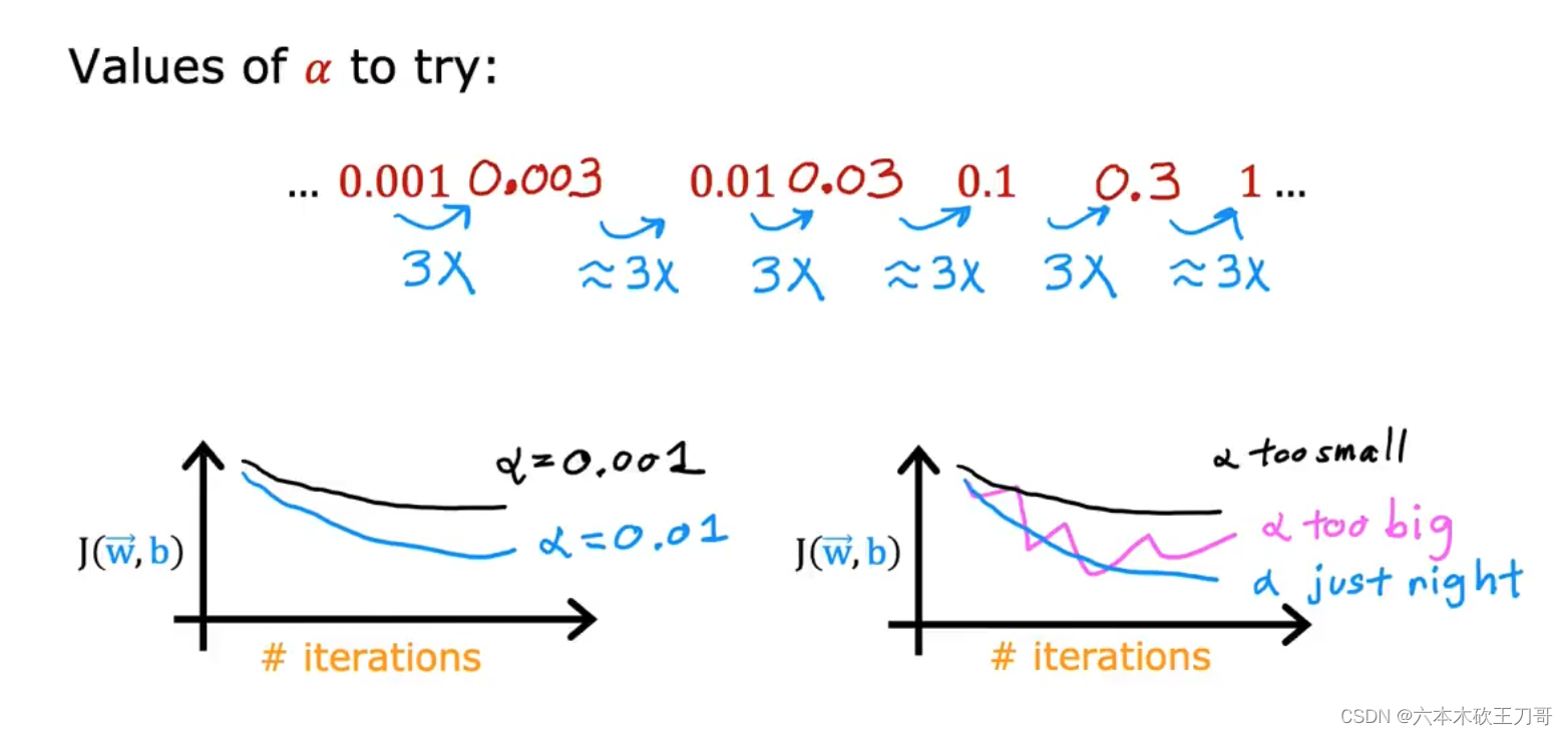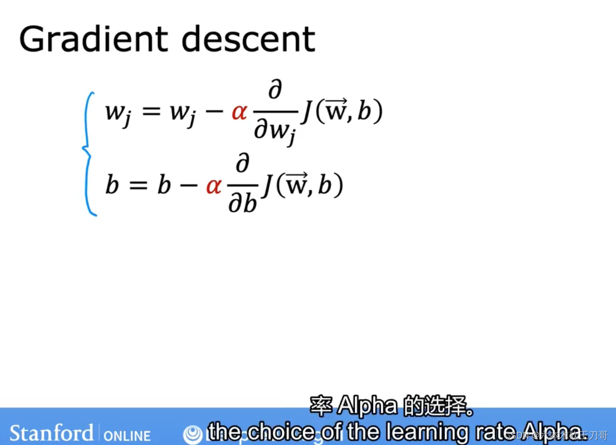 对w赋值,使得𝐽(w)按梯度下降最快方向进行,一直迭代下去,最终得到局部最小值。其中𝑎是学习率(learning rate),它决定了我们沿着能让代价函数下降程度最大的方向向下迈出的步子有多大。