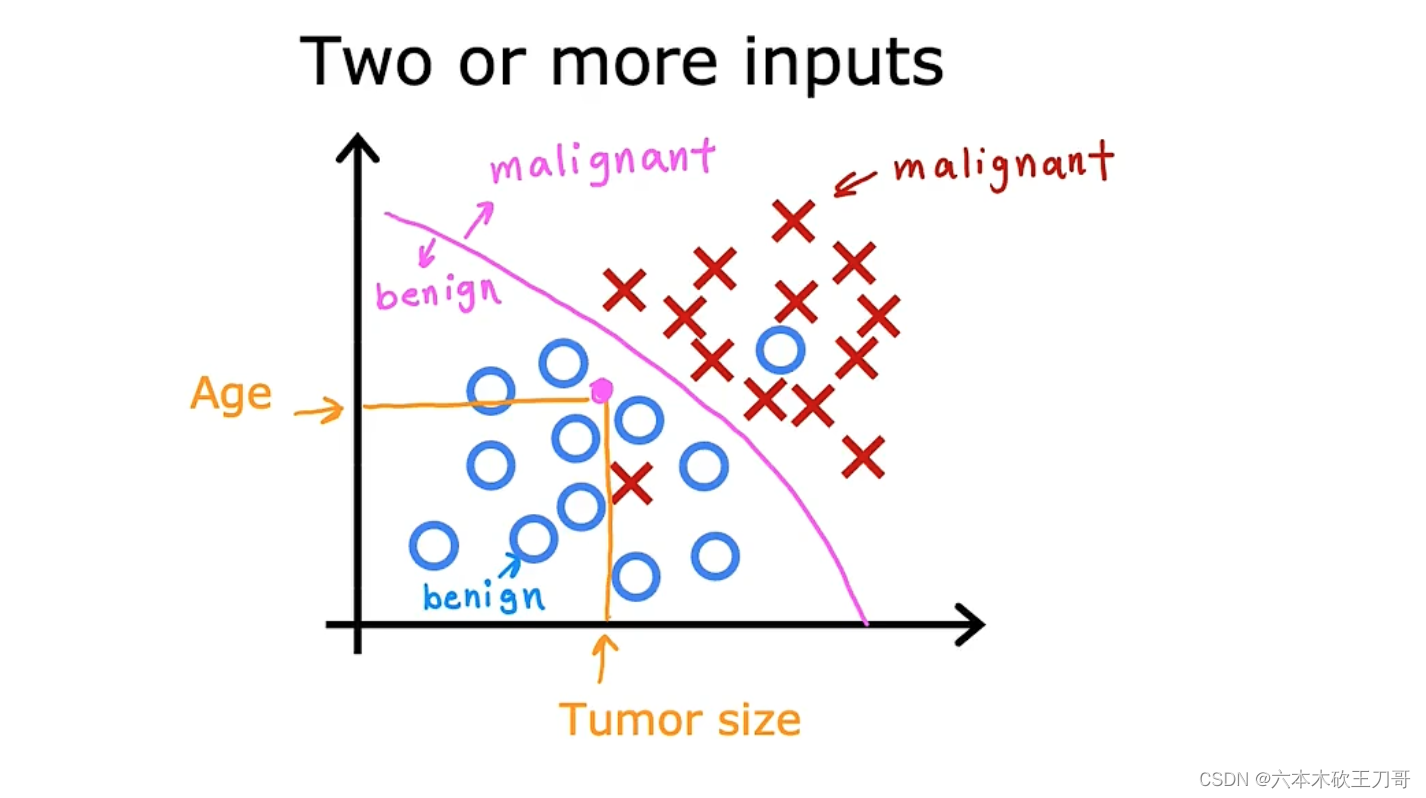 在其它一些机器学习问题中,可能会遇到不止一种特征。举个例子,我们不仅知道肿瘤的尺寸,还知道对应患者的年龄。在其他机器学习问题中,我们通常有更多的特征,我朋友研究这个问题时,通常采用这些特征,比如肿块密度,肿瘤细胞尺寸的一致性和形状的一致性等等,还有一些其他的特征。这就是我们即将学到最有趣的学习算法之一。