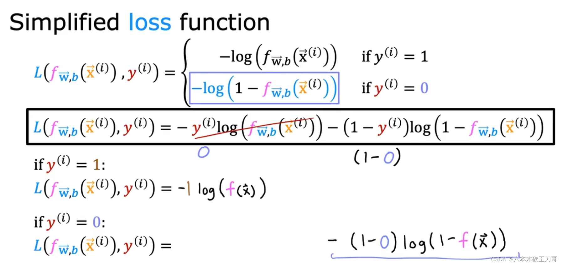 下图展示了简化后的损失函数 loss function,当y取0或者1的时候,得到的函数值和之前一样。