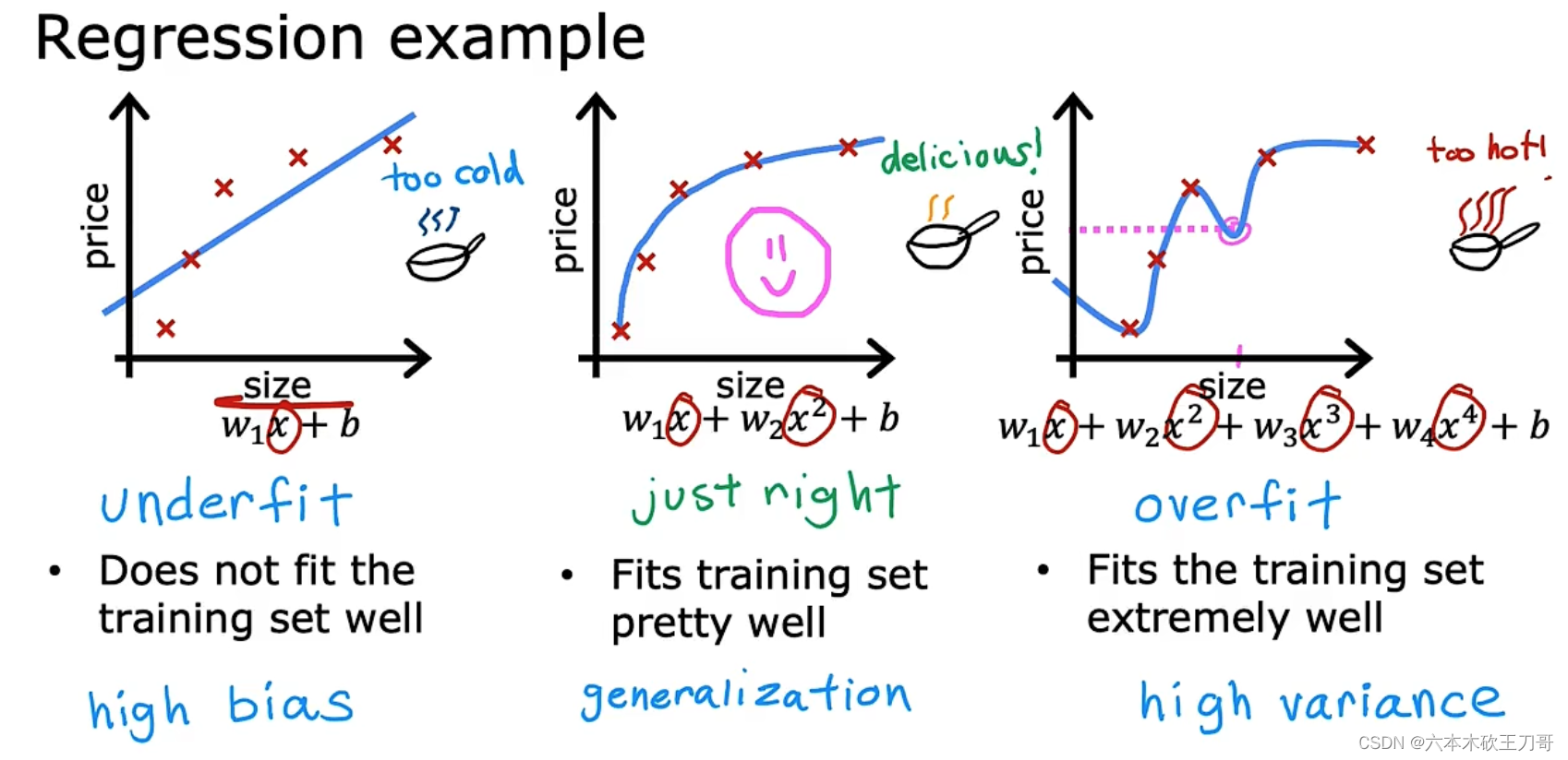 下面的例子中,第一个模型是一个线性模型,欠拟合 high bias,不能很好地适应我们的训练集,它以一次方程一种很强的preconception来拟合数据,或者说是有很强的bias认为这个房价预测问题将以一次直线来拟合;