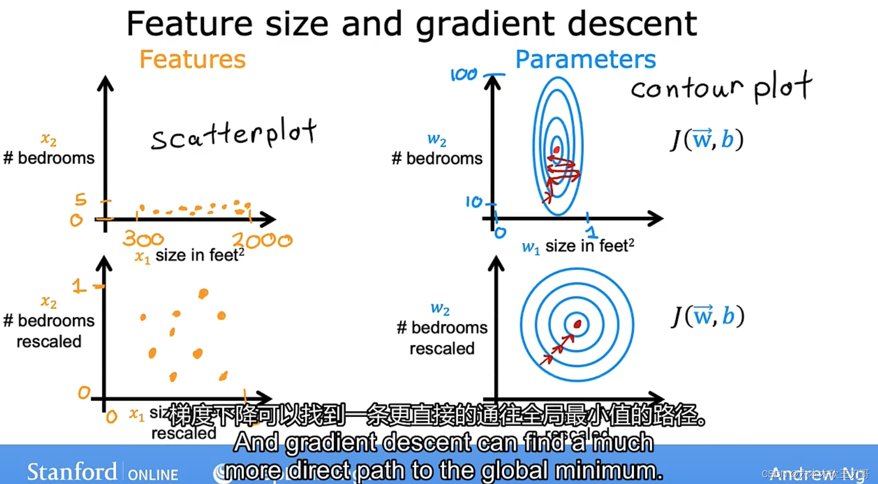 问题:当特征范围相差太大时,会一直来回振荡,梯度下降效率低。